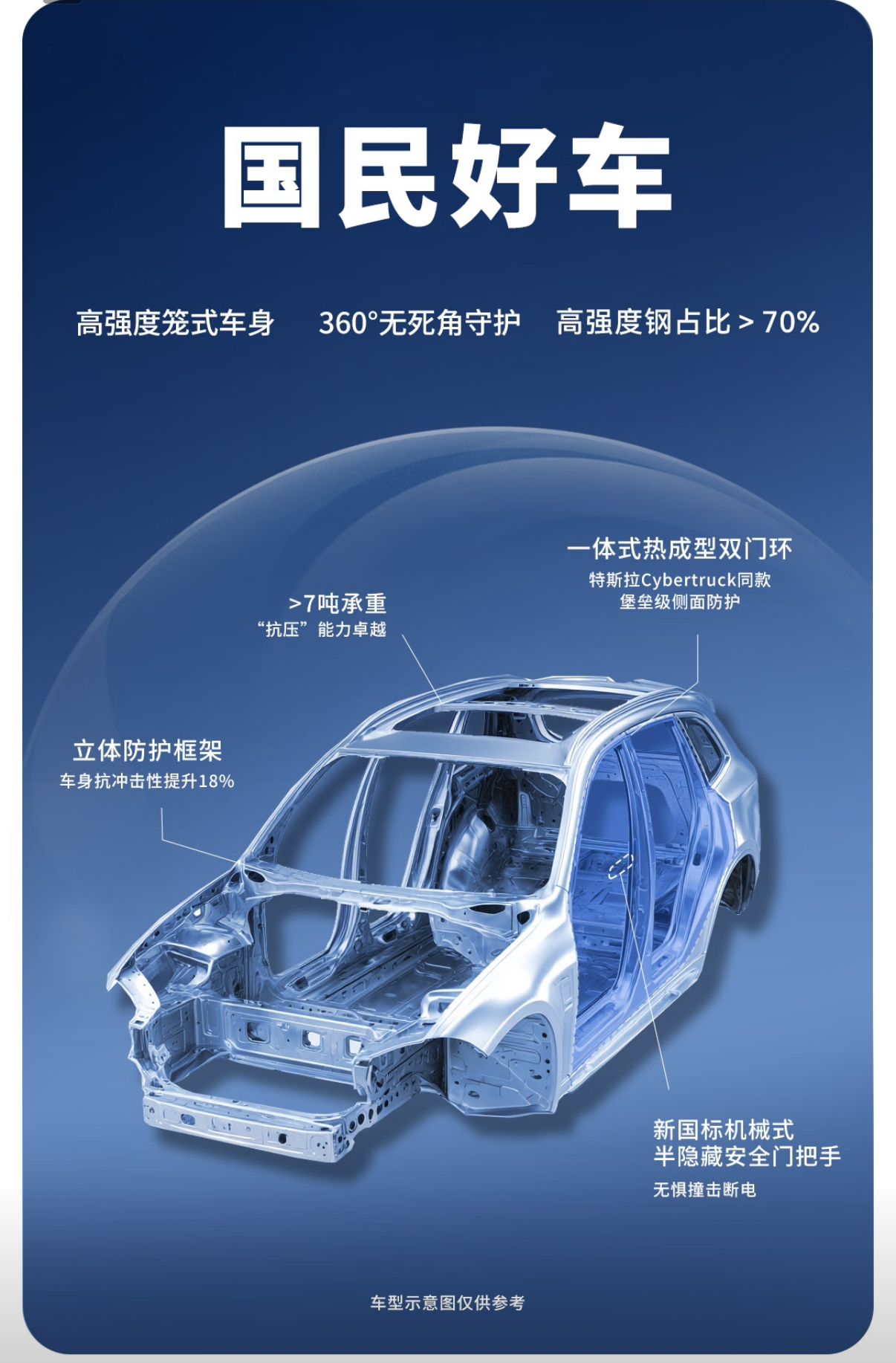 京东相关车辆预约页面显示,该车在车身结构方面,采用高强度笼式车身设计,高强度钢占比超70%融期策略,正面立体防护框架使车身抗冲击性提升18%;侧面配备一体式热成型双门环,采用特斯拉Cybertruck同款侧面防护技术,搭配新国标机械式半隐藏安全门把手。在性能层面,车辆整备质量超同级车型300kg,轮距超同级(同级别车辆)水平45mm、胎宽超同级水平10mm;麋鹿测试成绩超75km/h。