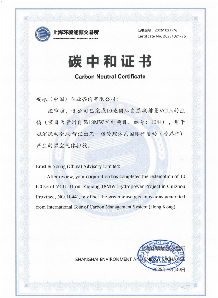 2025年10月30日,由上海环交所、安永(中国)企业咨询有限公司联合主办的“绿动全球 智汇出海——碳管理体系国际行香港站”活动在香港成功举行。上海环交所总经理徐鸣一、安永大中华区业务主管合伙人毕舜杰、南京江宁经济技术开发区管理委员会副主任张振、各碳管理体系服务中心代表出席本次活动。